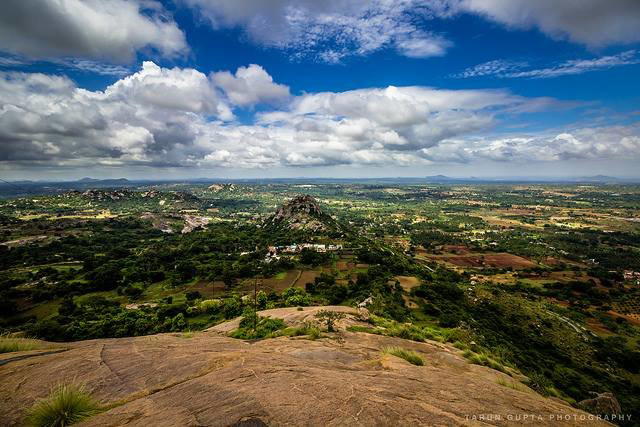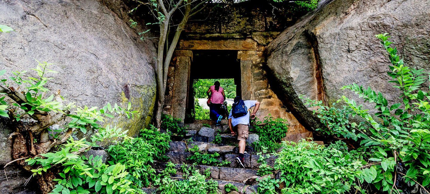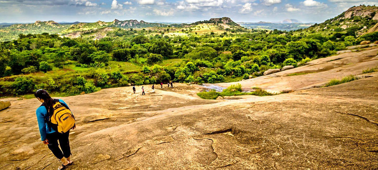 Uttari Betta is a 4 kms trek across a spectacular lush green landscape which offers a quite unique scenic views similar to western ghats, it is also One of the Karnataka's greatest day hike. The trek starts from a small village, entering the fort wall and passes through seven doors of stone to reach the halfway point of the hike which has a temple of Shankareswar at the top. The view from the temple top is beautiful enough to seize your mind for a moment. Once we cross the temple, the trek continues ahead crossing a small jungle-cave, experiencing a whole new unexpected world and ends at the grassland top of the hill which is surrounded by huge boulders. After spending some time at the top with little chit-chat and pack lunch, we begin to descend back towards the base point of the trek.